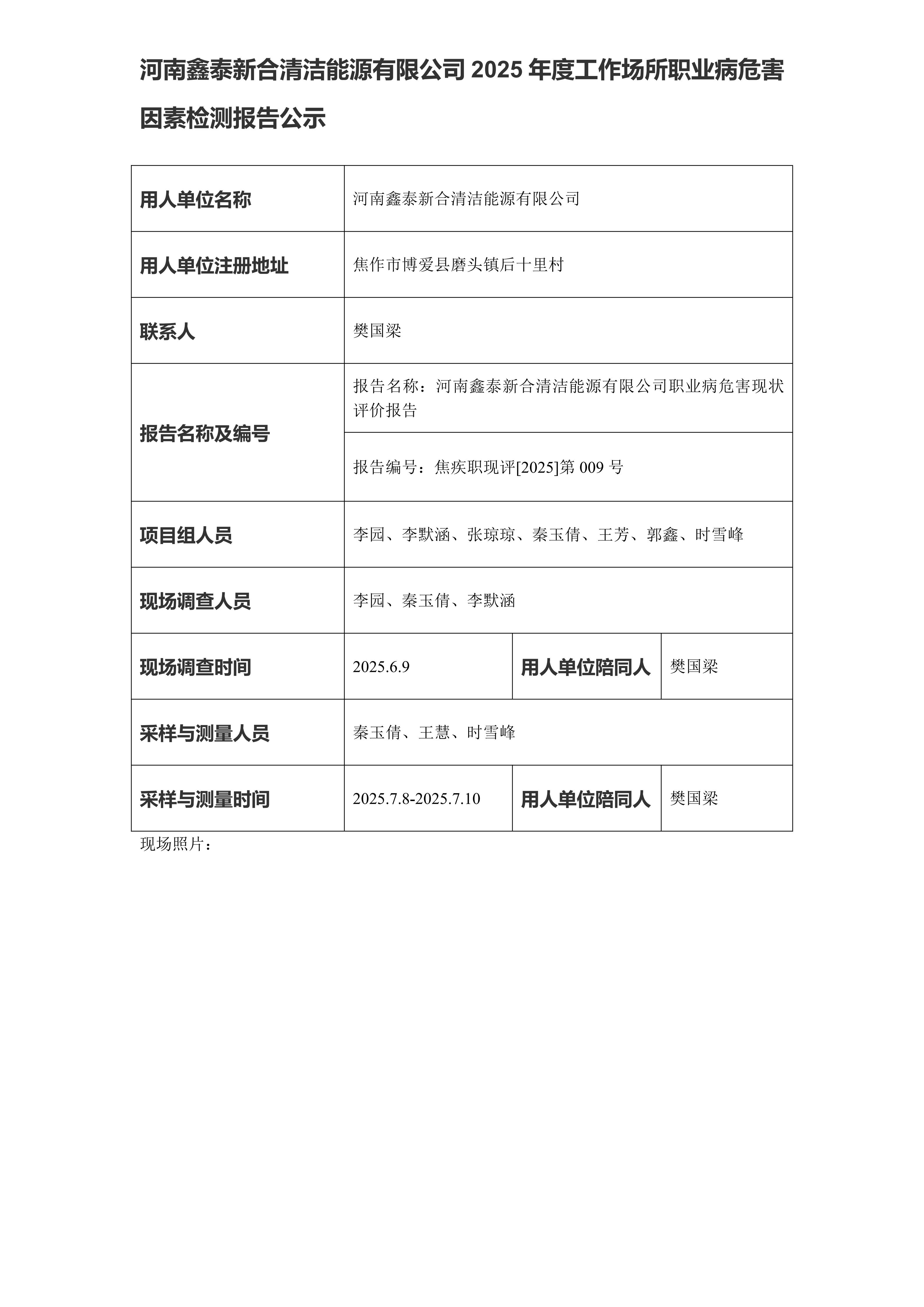 河南鑫泰新合清洁能源有限公司2025年度工作场所职业病危害因素检测报告公示