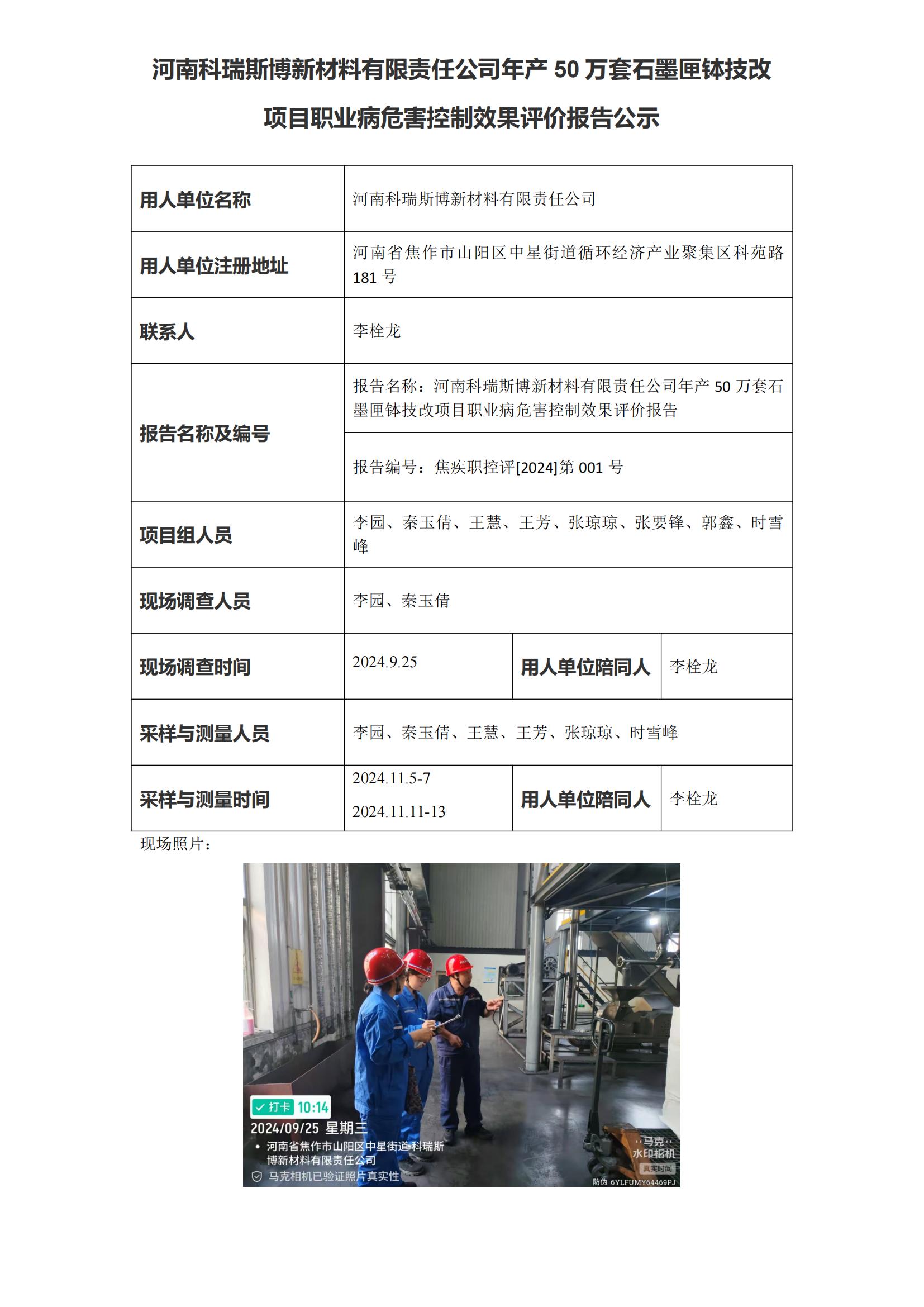 河南科瑞斯博新材料有限责任公司年产50万套石墨匣钵技改项目职业病危害控制效果评价报告公示