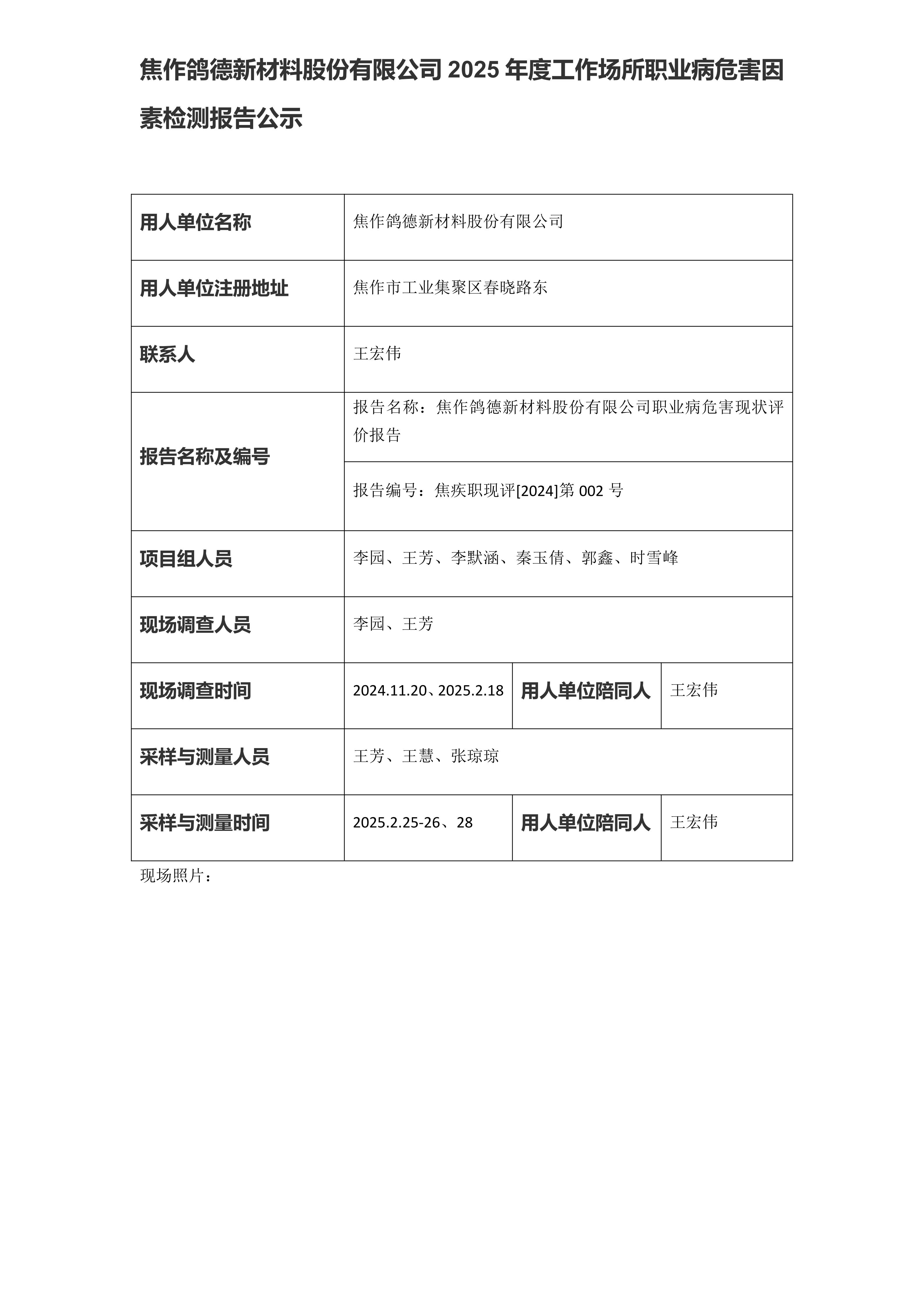 焦作鸽德新材料股份有限公司2025年度工作场所职业病危害因素检测报告公示